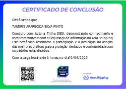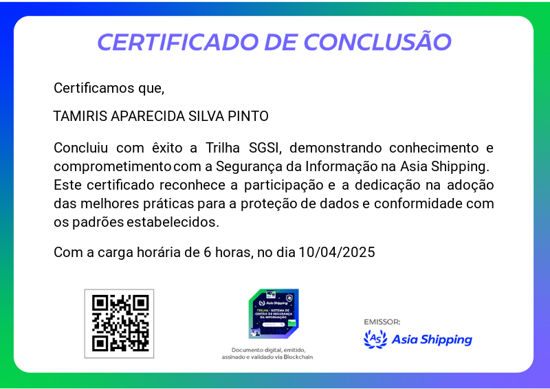 Esta badge é concedida aos colaboradores que completaram com sucesso a trilha de cursos sobre Segurança da Informação, demonstrando conhecimento e compromisso com as melhores práticas de proteção de dados e a conformidade com a política de segurança da Asia Shipping.