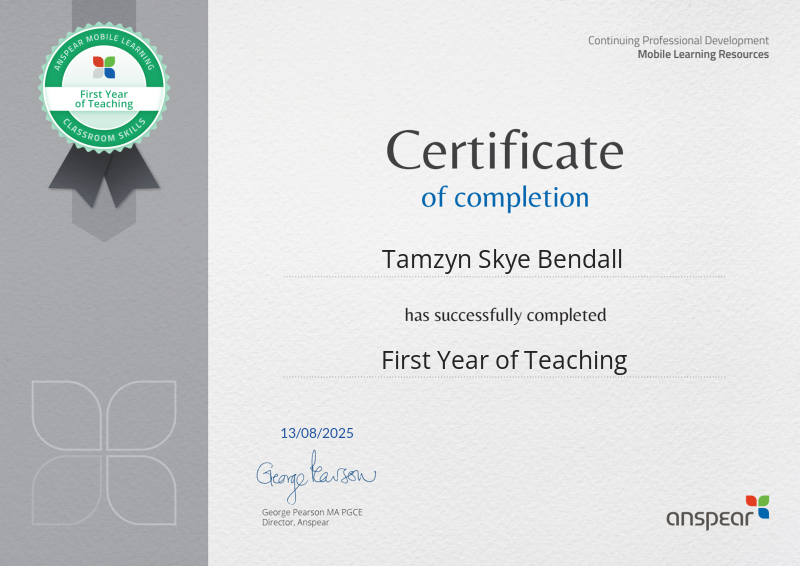 Awarded for completing the First Year of Teaching CPD course from Anspear.