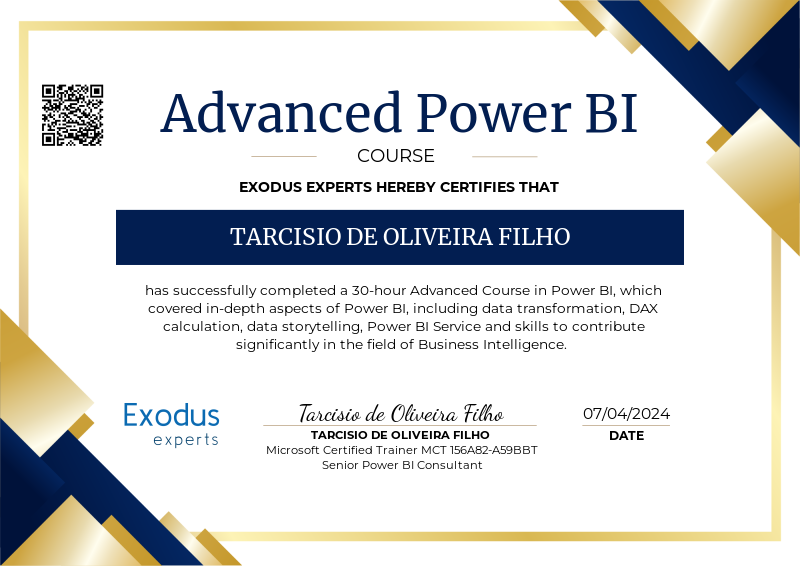 The student has successfully completed the Advanced Course in Power BI, demonstrating exemplary proficiency in the following key areas: