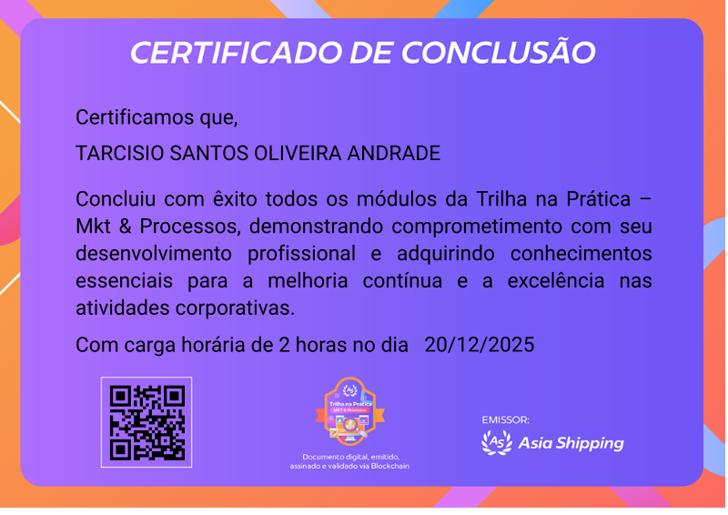 Certifica a conclusão da Trilha na Prática – Mkt & Processos, referente as campanhas de marketing e otimização de processos internos.