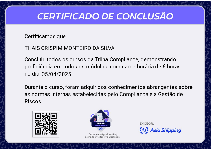 A Trilha Compliance é mais uma Badge do programa de certificação da Asia Shipping. Com ela você terá a oportunidade de conhecer mas sobre Compliance na Asia Shipping, como também Gestão de Riscos, suas principais definições e etapas de identificação.