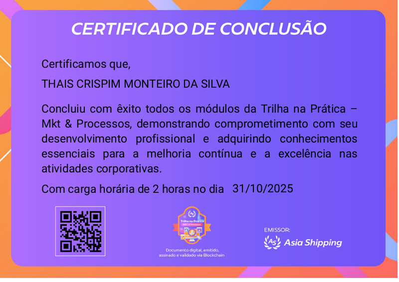 Certifica a conclusão da Trilha na Prática – Mkt & Processos, referente as campanhas de marketing e otimização de processos internos.