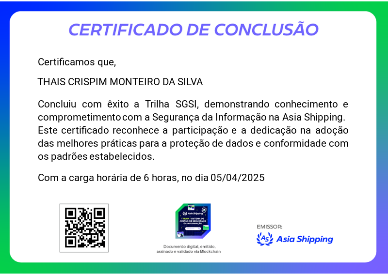Esta badge é concedida aos colaboradores que completaram com sucesso a trilha de cursos sobre Segurança da Informação, demonstrando conhecimento e compromisso com as melhores práticas de proteção de dados e a conformidade com a política de segurança da Asia Shipping.