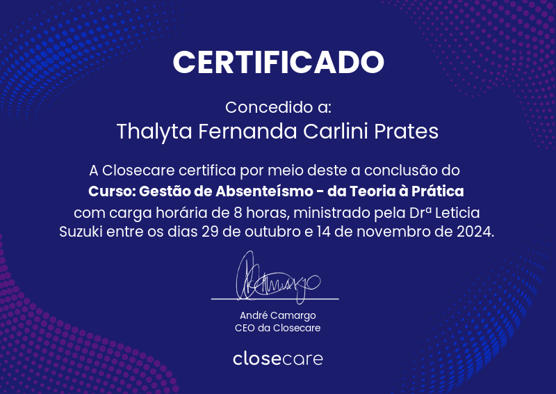O curso de Gestão de Absenteísmo: da Teoria à Prática aconteceu online e ao vivo entre os dias 29 de outubro e 14 de novembro. As aulas foram ministradas pela Drª Leticia Suzuki (https://www.linkedin.com/in/leticia-cristina-suzuki-621585131/). O curso foi composto por seis aulas que abordaram os seguintes tópicos: