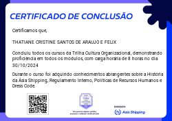A Trilha Cultura Organizacional é mais um badge do programa de certificação da Ásia Shipping. Nela você terá a oportunidade de conhecer sobre a História da Ásia Shipping, além do Regulamento Interno, Políticas de Recursos Humanos e orientações de Dress Code.