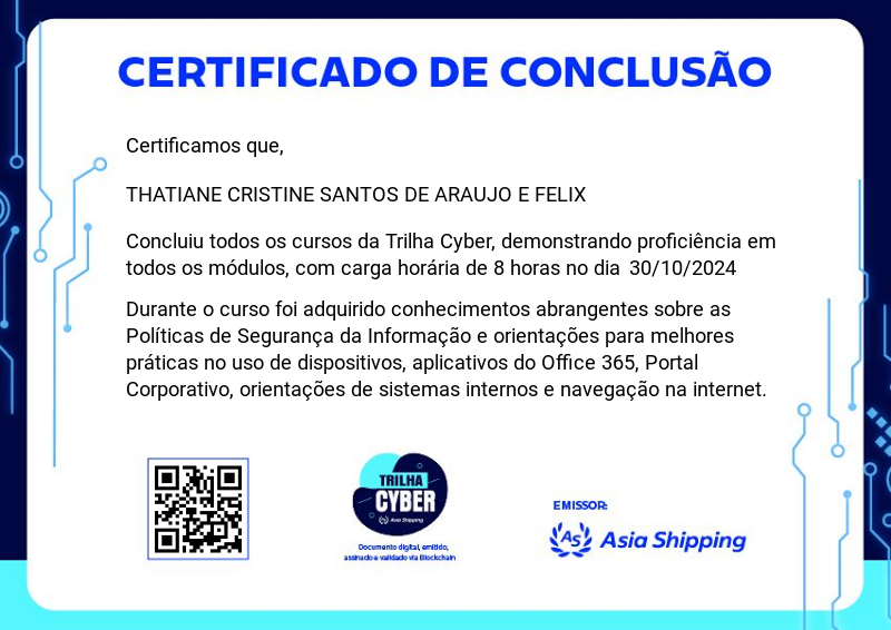 A Trilha Cyber é um dos badges do programa de certificação da Asia Shipping. Ela aborda as melhores práticas de uso dos sistemas internos e do e-mail corporativo, reforçando a segurança e a eficiência no ambiente digital.