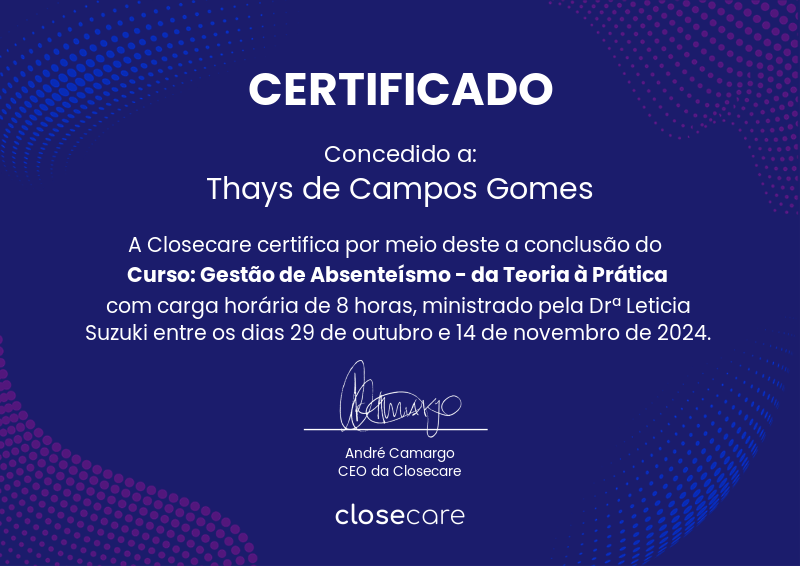 O curso de Gestão de Absenteísmo: da Teoria à Prática aconteceu online e ao vivo entre os dias 29 de outubro e 14 de novembro. As aulas foram ministradas pela Drª Leticia Suzuki (https://www.linkedin.com/in/leticia-cristina-suzuki-621585131/). O curso foi composto por seis aulas que abordaram os seguintes tópicos: