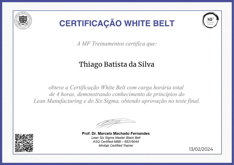 Desbloqueando os princípios fundamentais do Lean Six Sigma, a certificação White Belt oferecida pela MF OPEX, liderada pelo Professor Marcelo Fernandes, destaca-se como um farol de excelência em treinamento operacional. Através de um currículo abrangente que combina teoria com aplicação prática, os participantes adquirem insights inestimáveis sobre redução de desperdícios, gestão de variação e melhoria contínua. A expertise do Professor Fernandes infunde o programa com práticas líderes do setor, equipando os aprendizes com o conhecimento e as habilidades necessárias para impulsionar melhorias tangíveis dentro de suas organizações. Servindo como catalisador para o crescimento profissional, esta certificação abre caminho para avanços adicionais no campo da excelência operacional, capacitando os indivíduos a se tornarem agentes de mudança positiva em suas respectivas indústrias.