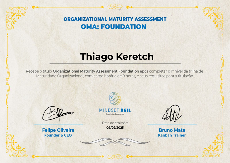 Para receber o certificado Organizational Maturity Assessment Foundation, o/a profissional deve completar uma formação credenciada pela Mindset Ágil®, de 9 horas, participando de todas sessões da formação. Além disso, deve cumprir com todos os deveres relacionados ao trabalho de conclusão, apresentando o case para a turma.