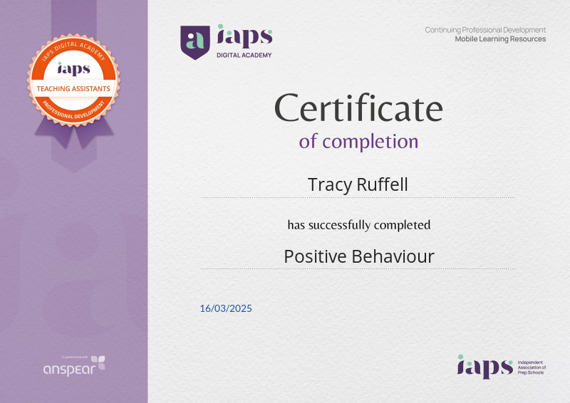 Awarded for completing the Positive Behaviour: TAs CPD course from the IAPS Digital Academy.