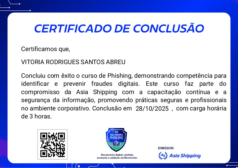 O badge de treinamento em Phishing faz parte do programa de certificação da Asia Shipping e capacita os participantes a reconhecer e evitar tentativas de fraude digital. Com foco em práticas seguras de comunicação e proteção de dados no ambiente corporativo, o treinamento prepara os colaboradores para identificar ameaças e fortalecer a segurança da informação na empresa.