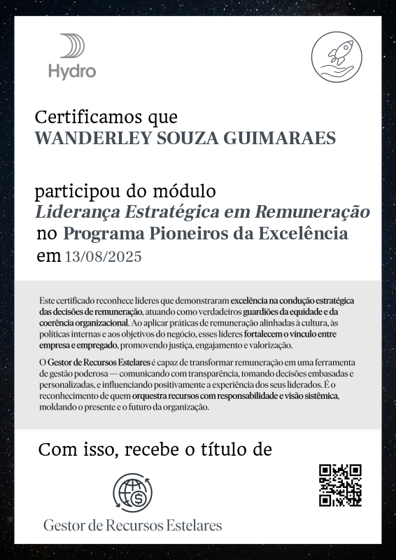 O Gestor de Recursos Estelares é capaz de transformar remuneração em uma ferramenta de gestão poderosa — comunicando com transparência, tomando decisões embasadas e personalizadas, e influenciando positivamente a experiência dos seus liderados. É o reconhecimento de quem orquestra recursos com responsabilidade e visão sistêmica, moldando o presente e o futuro da organização.