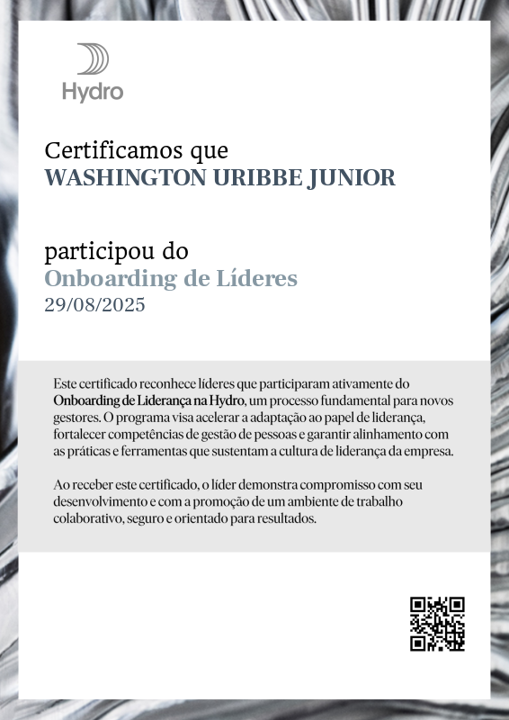 Esta badge reconhece líderes que participaram ativamente do Onboarding de Liderança na Hydro, um processo fundamental para novos gestores. O programa visa acelerar a adaptação ao papel de liderança, fortalecer competências de gestão de pessoas e garantir alinhamento com as práticas e ferramentas que sustentam a cultura de liderança da empresa.