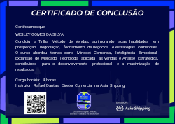 Este Badge Digital reconhece a conclusão da Trilha Método de Vendas, ministrado por Rafael Dantas, Diretor Comercial na Asia Shipping, abrangendo estratégias avançadas de prospecção, negociação e fechamento. O profissional desenvolveu habilidades em Mindset Comercial, Inteligência Emocional, Expansão de Mercado, Tecnologia aplicada às vendas e Análise Estratégica, aprimorando sua capacidade de gerar valor e maximizar resultados comerciais.