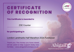 This certificate and badge is awarded in recognition of taking part in the London Landmarks Half Marathon, as part of Abigail’s Footsteps’ largest fundraising event of the year.